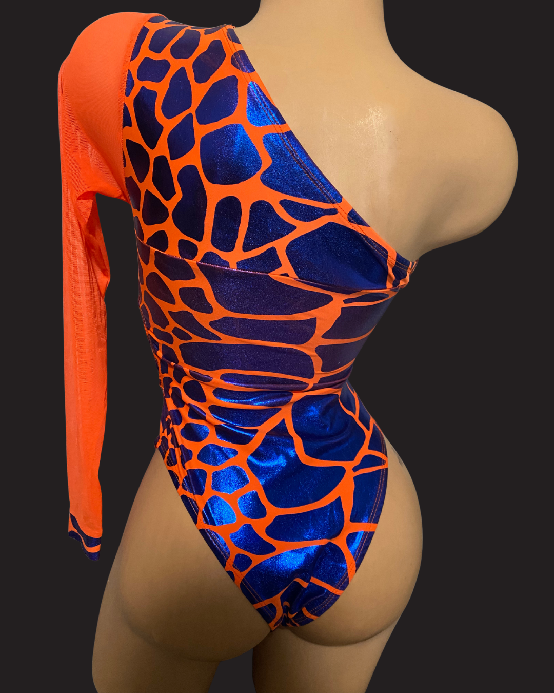 Be the first to snag this exclusive, ready-to-ship outfit! Crafted from vibrant printed spandex, it hugs your curves while keeping you comfortable and bold. The unique one-sleeve mesh design adds an edgy, daring twist—perfect for bartenders, club-goers, or festival lovers looking to stand out. With only one available, this standout piece won’t last long—grab it before it’s gone!